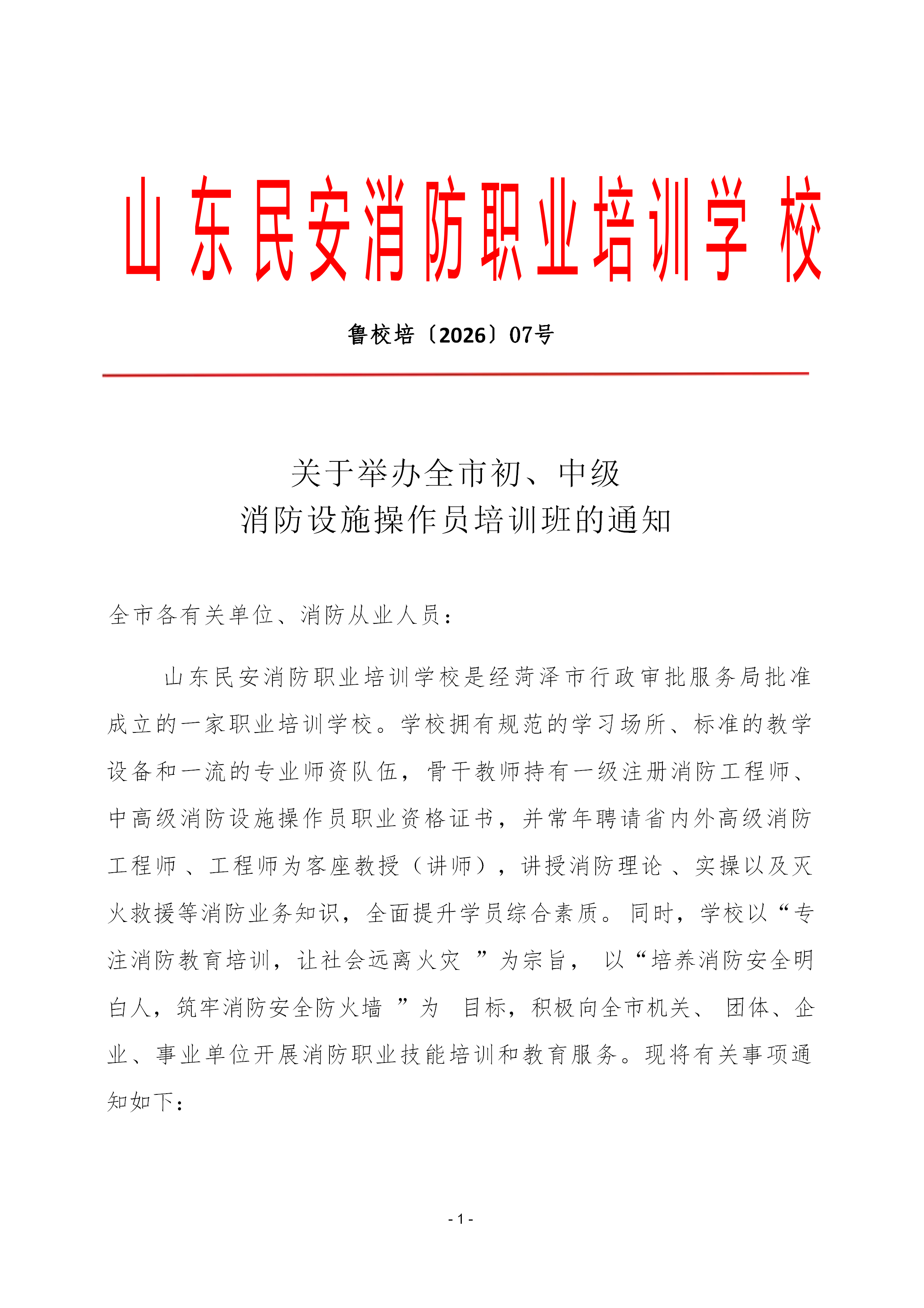 关于举办消防设施操作员培训开班通知